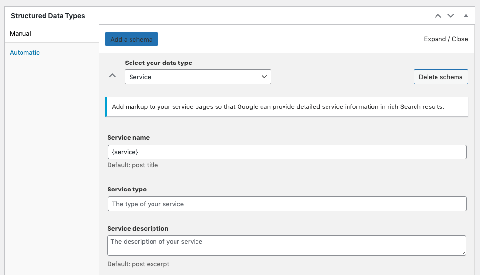 Define your schemas and their field values as necessary, including Keywords and Spintax if required.