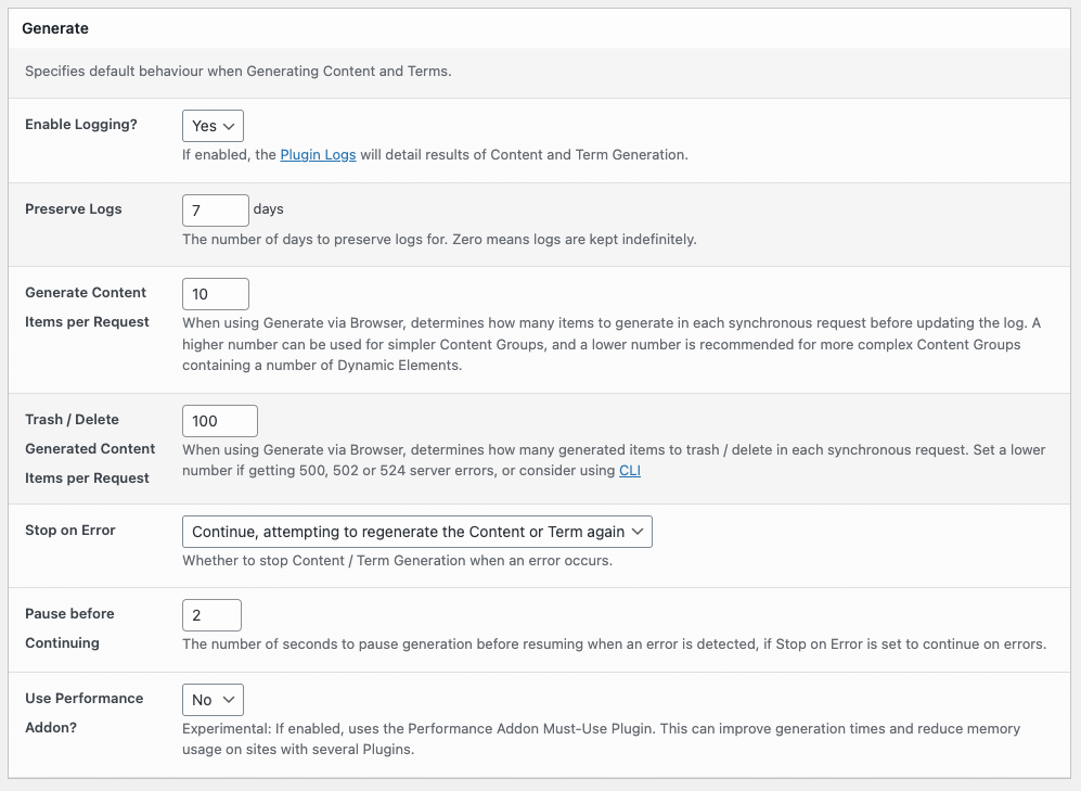 If enabled, the Plugin Logs will detail results of Content and Term Generation performed via Browser, Server and WP-CLI.