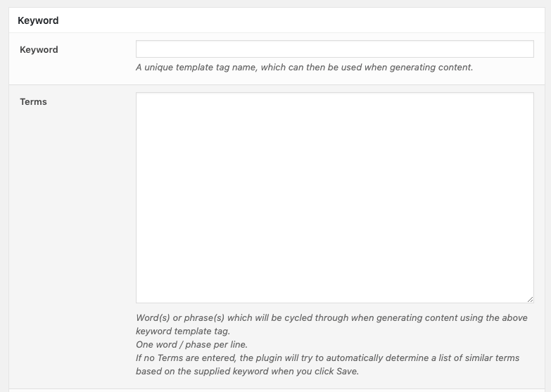 - This is the list of words or phrases that will be cycled through when generating content that contains this Keyword.
