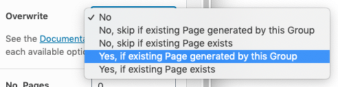 The Overwrite option allows us to overwrite existing Pages that were previously generated by this Group, matching the Permalink. This is useful if we need to re-generate our Pages because we fix a typo, or change the content, and don’t want to end up with duplicate Pages describing the same service and location.