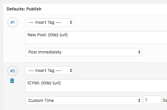 For example, you could define three short status updates for your Twitter profile, to be posted every week after a Post is published, alongside two Facebook status updates which contain more content.